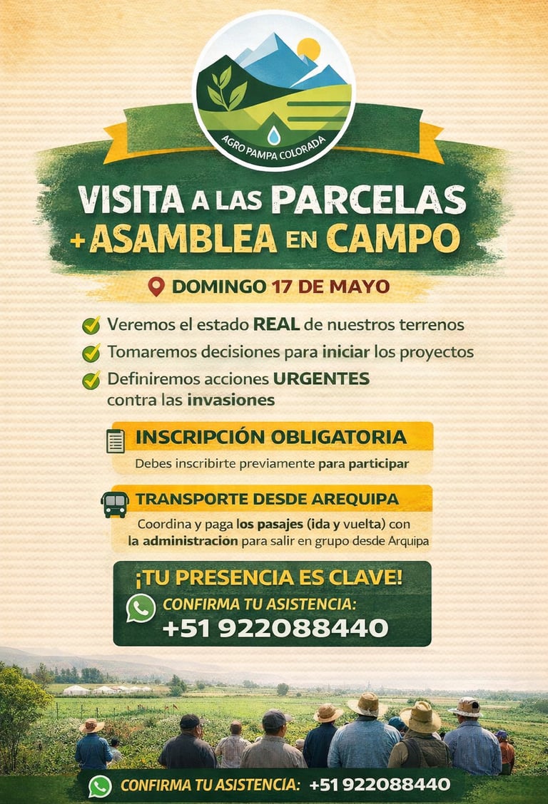 Se convoca a todos los socios, propietarios y miembros de la Empresa Agro Inversiones Pampa Colorada S.A., a participar en la Visita de Inspección y Asamblea en Campo, que se llevará a cabo el día domingo 17 de mayo en las parcelas de la Irrigación Pampa Colorada – Camaná.
